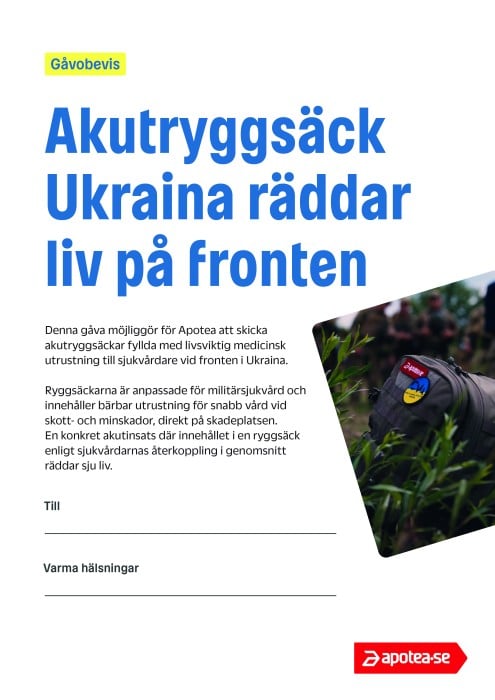 Detta är en digital produkt och via köpet skänker du pengar. Pengar som möjliggör för Apotea att skicka akutryggsäckar direkt till sjukvårdare vid fronten i Ukraina. Gåvan går oavkortat till inköp av ryggsäck och innehåll för akutvård som packas hos oss och skickas direkt till Ukraina via upparbetade kontakter, utan påslag.