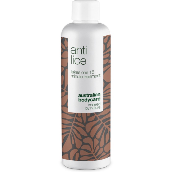 Australian Bodycare Anti Lice är ett medel som verkar fysiskt genom att kväva löss och gnetter. Fördela Anti Lice jämnt i torrt hår och hårbotten och låt verka i 15 minuter. Anti Lice innehåller bl a dimethicone och tea tree-olja.