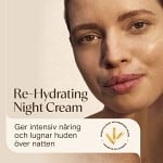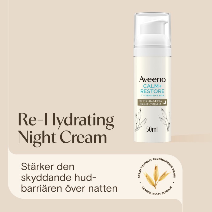 Aveeno Calm+Restore Re-Hydrating Night Cream är en oparfymerad och dermatologiskt testad nattkräm som intensivt återfuktar känslig hud och stärker den skyddande hudbarriären under natten när du sover, för lugnad hud på morgonen. Nattkrämen är kliniskt bevisad att ge huden 48 timmars återfuktning. Krämen passar för normal till torr hud samt känslig hud.