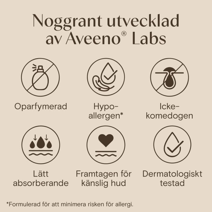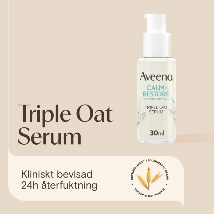 Aveeno CALM+RESTORE® Triple Oat Serum är ett ansiktsserum som har en lätt konsistens och som absorberas lätt av huden. Formuleringen, med trippelt havrekomplex och lugnande feverfew, hjälper till att ge näring till och lugna huden. Serumet mjukgör snabbt, lugnar och stärker hudens fuktbarriär och gör att huden är återfuktad i upp till 24 timmar.