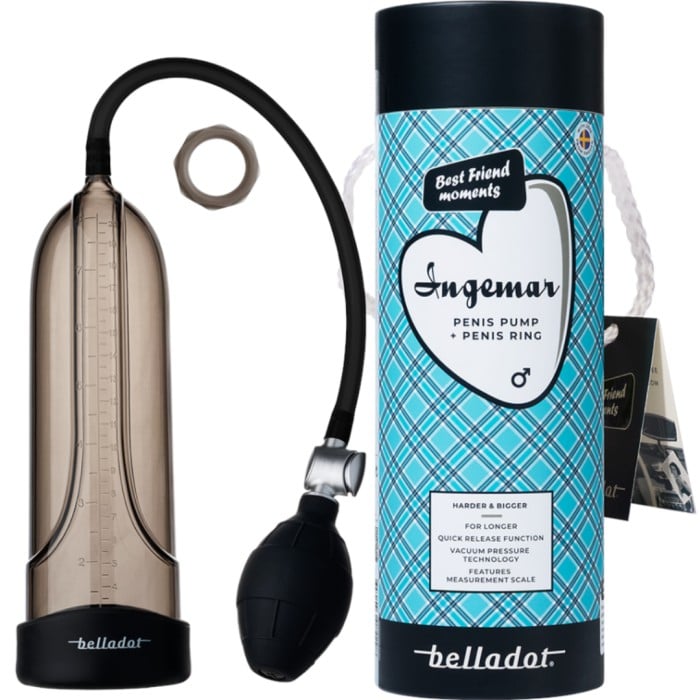 Belladot Ingemar är en effektiv erektionspump som hjälper dig att uppnå och behålla en starkare erektion. Kan användas både som lusthöjare och som hjälpmedel vid erektionsproblem. Den uppdaterade designen har en cylinder på 22 centimeter med tydlig mätskala. Den har en mjuk komfortkant i kroppssäker silikon som ger en tät och behaglig passform mot huden.
