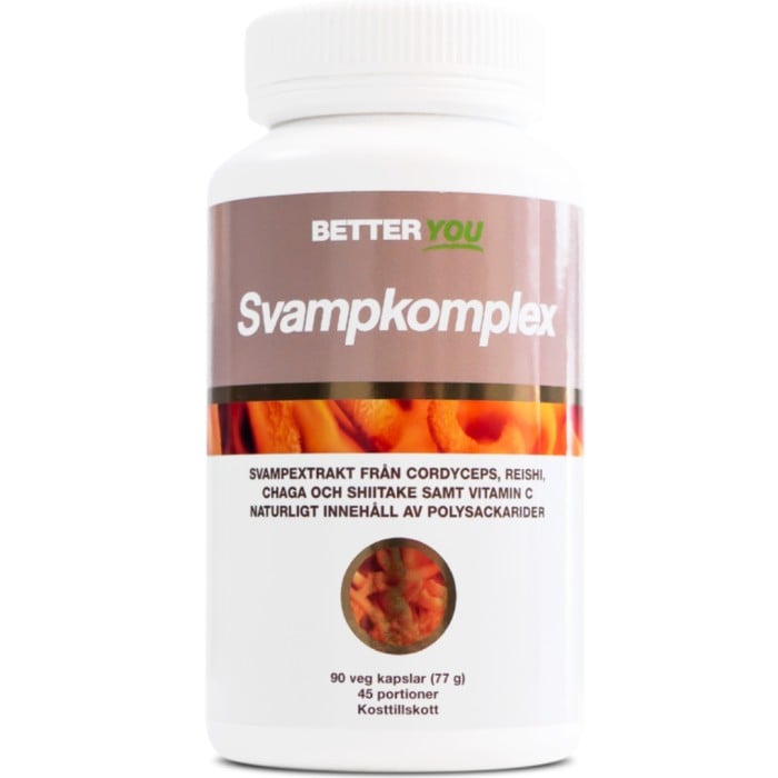 Better You Svampkomplex är ett kosttillskott med en blandning av cordyceps, reishi, chaga och shiitake samt C- vitamin.