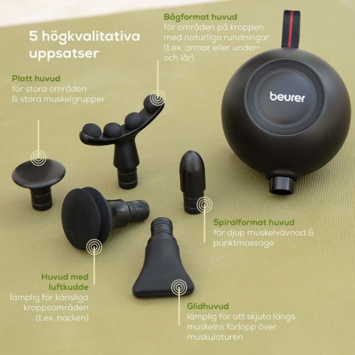 - Fem högkvalitativa massagetillbehör: Inkluderar tillbehör för personlig användning, riktade mot olika muskelgrupper