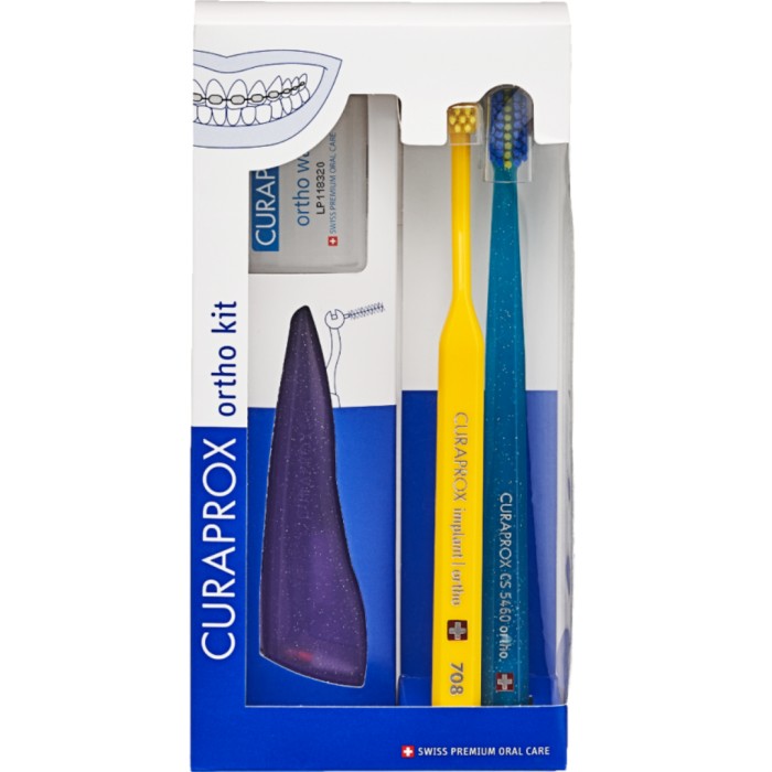 Curaprox Ortho Kit innehåller det du behöver för att sköta din tandställning: vax för att undvika skav, soloborste för precisionsrengöring, ortho-tandborste utformad för rengörning av tandställningen, mellanrumsborste för rengöring.