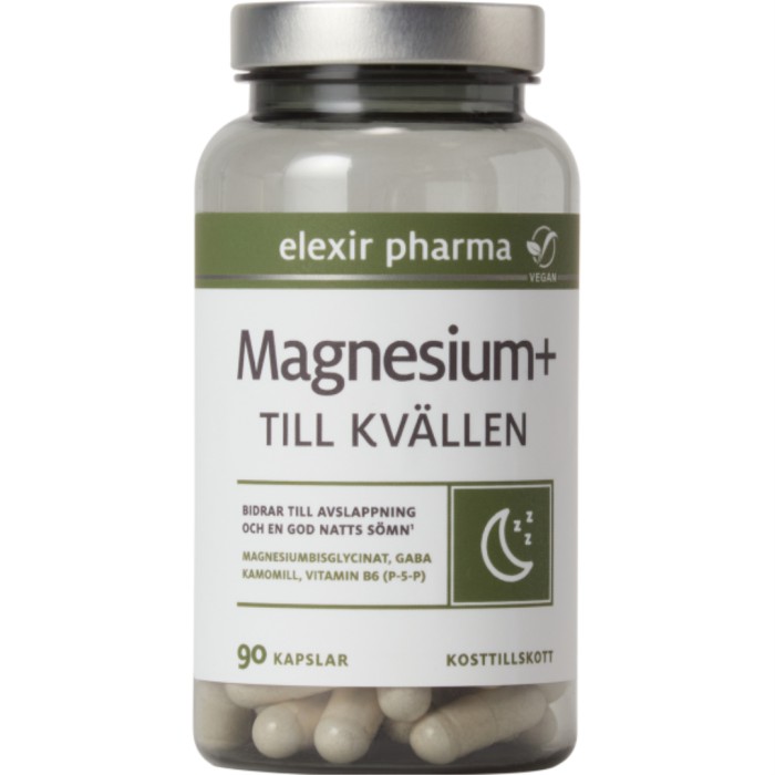 • 110 mg magnesium per kapsel• Magnesiumbisglycinat• Med GABA och kamomill• För avslappning och en god natts sömn• Med aktiv vitamin B6 (P-5-P)Magnesium+ Till kvällen från Elexir Pharma innehåller magnesiumbisglycinat tillsammans med GABA, kamomillextrakt och vitamin B6. Magnesium är ett mineral som deltar i många av kroppens biokemiska reaktioner och behövs för att aktivera mer än 300 olika enzymer! Magnesium behövs för musklernas och nervsystemets normala funktion. Magnesiumbisglycinat är en organisk form med hög biotillgänglighet bestående av magnesium bundet till aminosyran glycin. Produkten är kompletterad med GABA (gamma-aminosmörsyra) och extrakt från kamomill. Kamomill bidrar till avslappning och en hälsosam sömn.Vitamin B6 är tillsatt i den aktiva formen P-5-P som bidrar till nervsystemets normala funktion. Produkten kan doseras upp och ner efter behov. 100% vegansk.