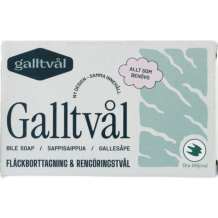Galltvåls fasta rengörings- och fläckborttagningstvål är en smidig tvål för all sorts rengöring. Galltvålen innehåller bland annat oxgalla och klorofyll som är effektiva mot olja, fett, fläckar från gräs, bär, frukt och grönsaker. Denna fasta tvål innehåller inga kemikalier, utan endast naturliga ämnen och är även biologiskt nedbrytbar. Oxgalla är ett beprövat, naturligt ämne för att få bort fettfläckar från plagg.