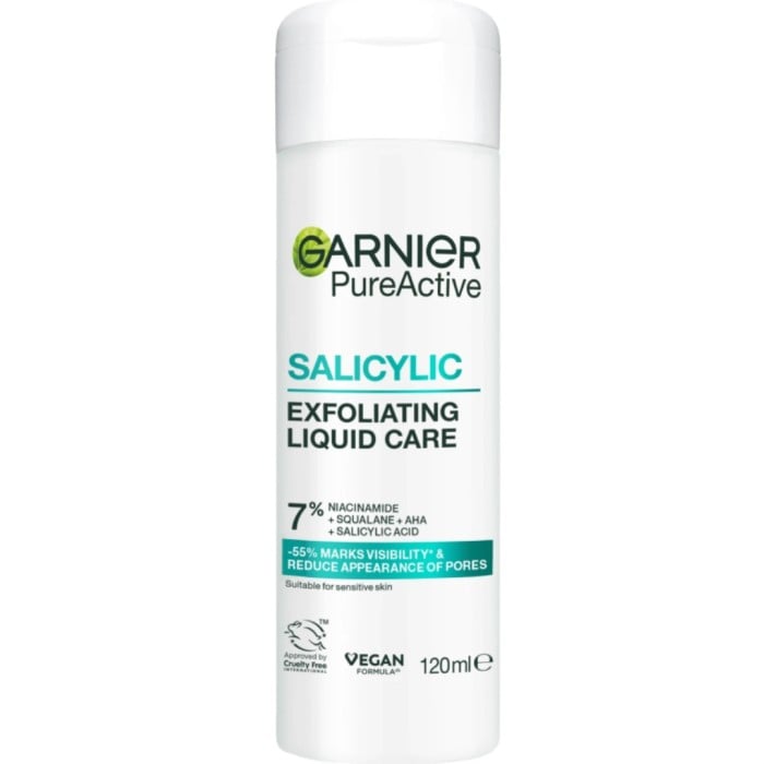 Garnier PureActive Salicylic Exfoliating Liquid Care är ett rengörande och exfolierande ansiktsvatten med salicylsyra för oren hud.