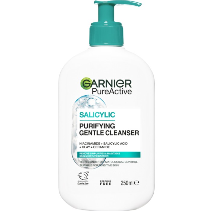 Garnier PureActive Salicylic Purifying Gentle Cleanser är en rengöringsgel som tar bort orenheter och skyddar hudens barriär. Denna fuktgivande ansiktsrengöring avlägsnar skonsamt orenheter, gör porer mindre synliga och ger en jämnare hudton. Formuleringen är berikad med [NIACINAMID + SALICYLSYRA + LERA + CERAMID] för att ta bort överflödig talg, hjälpa till att lugna huden och skydda den mot yttre aggressioner.