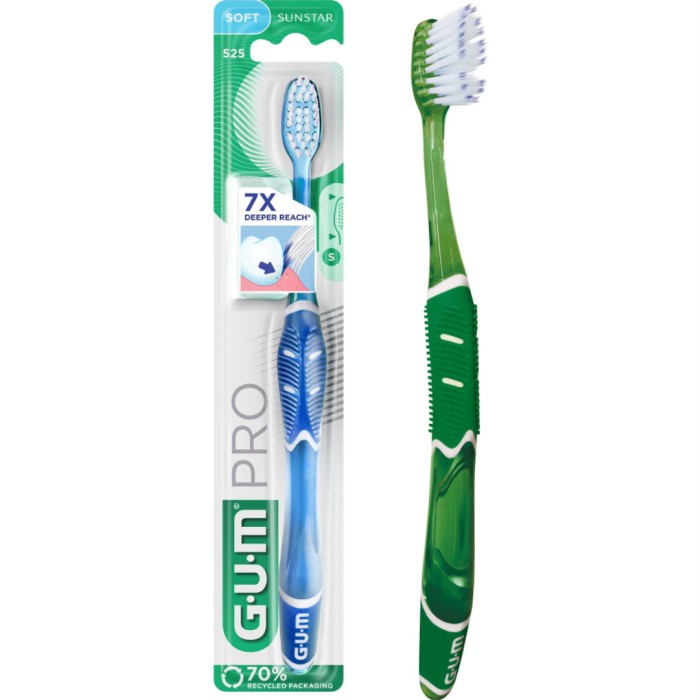 GUM Pro är en tandborste med borst som når längre ned mellan tänderna för att ta bort plack. Greppet gör att du får en 45-gradiga vinkel mot tandköttskanten när du borstar. Mjukt borsthuvud.