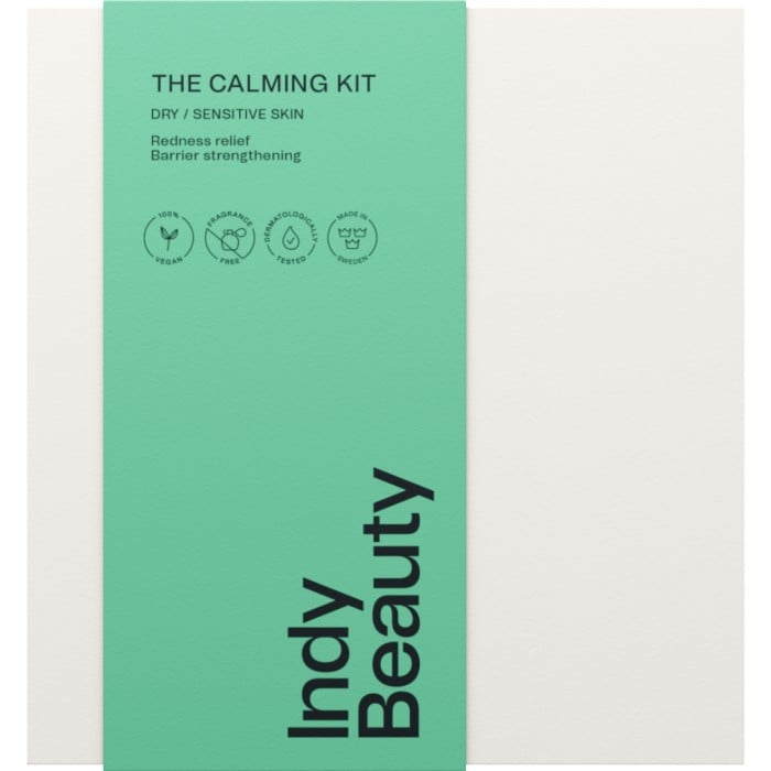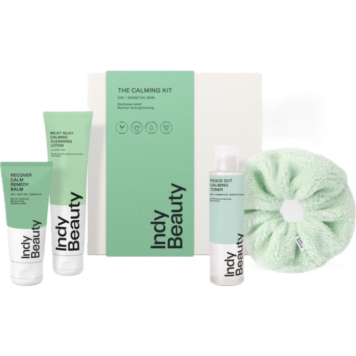 The Calming Kit från Indy Beauty är ett hudvårdskit för dig som har känslig eller reaktiv hud, framtaget för att vårda huden. Kitet innehåller tre hudvårdsprodukter (Cleansing Lotion, Calming Toner samt Calm Remedy Balm) + en scrunchie.