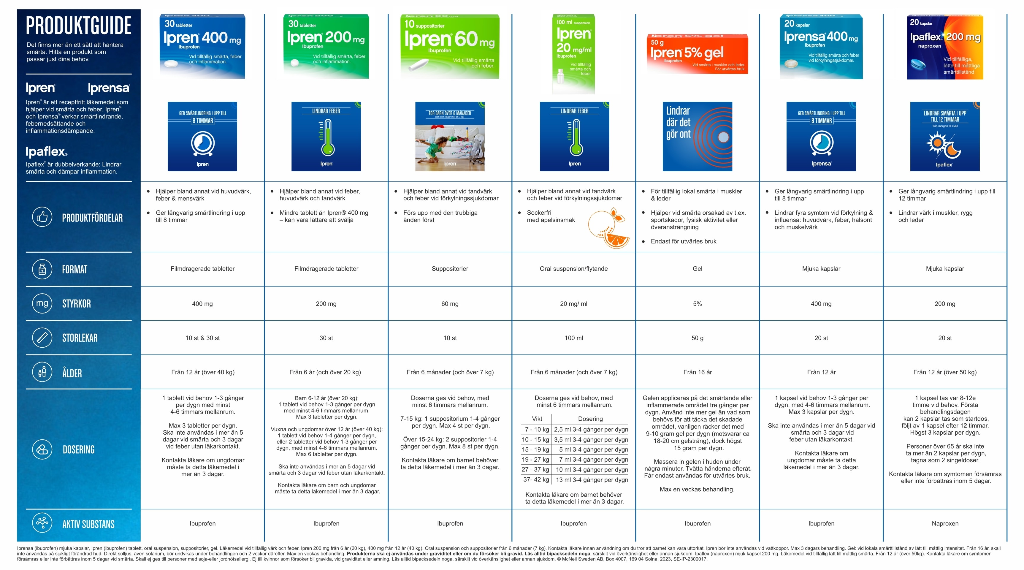 Iprensa (ibuprofen) mjuka kapslar, Ipren (ibuprofen) tablett, oral suspension, suppositorier, gel. Läkemedel vid tillfällig värk och feber. Ipren 200 mg tablett, från 6 år (20 kg). Oral suspension och suppositorier från 6 månader (7 kg). Kontakta läkare innan användning om du tror att barnet kan vara uttorkat. Ipren bör inte användas vid vattkoppor. 400 mg från 12 år. Gel: vid lokala smärttillstånd av lätt till måttlig intensitet. Från 16 år, skall inte användas på sjukligt förändrad hud. Direkt solljus, även solarium, bör undvikas under behandlingen och 2 veckor därefter. Max en veckas behandling. Gäller för alla beredningsformer: Skall ej användas under graviditet eller om du försöker bli gravid. Läs alltid bipacksedeln noga, särskilt vid överkänslighet eller annan sjukdom. Ipaflex (naproxen) mjuk kapsel 200 mg. Läkemedel vid tillfällig lätt till måttlig smärta. Från 12 år (över 50kg). Kontakta läkare om symtomen försämras eller inte förbättras inom 5 dagar vid smärta. Skall ej ges till personer med soja- eller jordnötsallergi. Ej till kvinnor som försöker bli gravida, vid graviditet eller amning. Läs alltid bipacksedeln noga, särskilt vid överkänslighet eller annan sjukdom. © McNeil Sweden AB, Box 4007, 169 04 Solna, 2023
