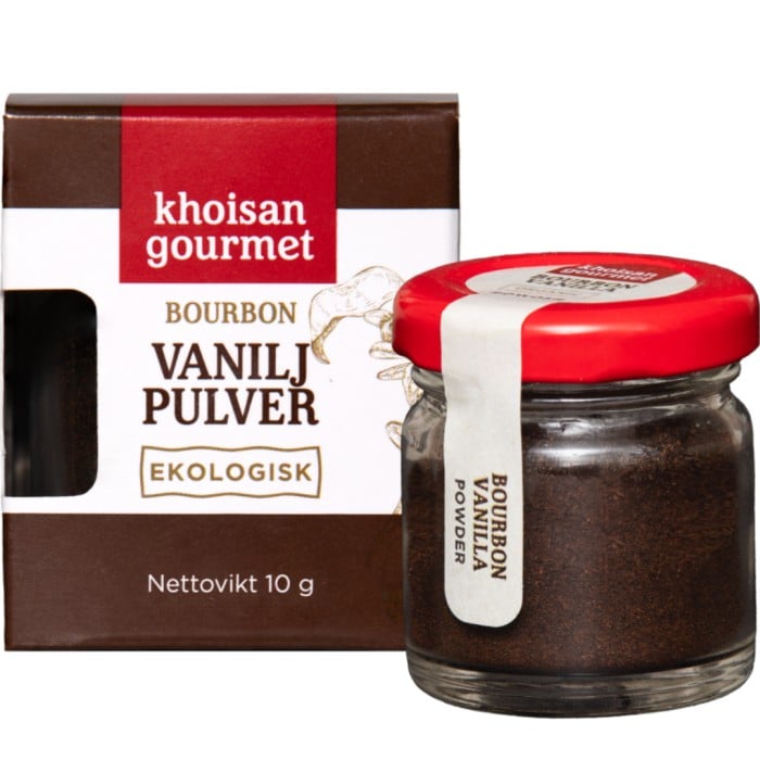Khoisan Gourmet Vaniljpulver är ett ekologiskt Bourbon-vaniljpulver som består enbart av malda vaniljstänger och är producerat utan konserveringsmedel eller tillsatser för att garantera högsta renhet och kvalitet.