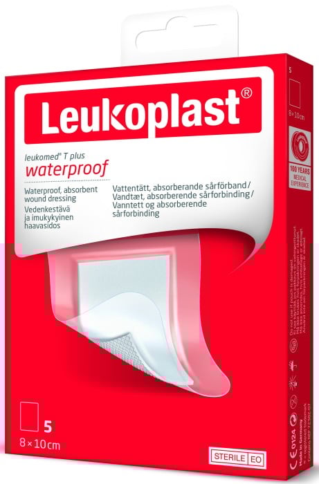 Leukomed T Plus Waterproof är ett sterilt absorberande vattentätt förband. Det duschbara förbandet har transparent fixerande film och kan användas vid skärsår och andra mindre sår. Den transparenta polyuretanfilmen är vatten-, bakterie- och virustät. Filmen är också semipermeabel vilket betyder att den andas och skyddar därmed mot maceration. Mycket tunn och transparent film som är behaglig att ha på och fastnar inte i kläder (friktionsfri yta). Absorptionsdyna som inte fastnar i såret. Ett bra förband att ha hemma.