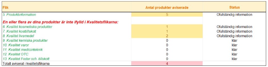 När du är klar, kontrollera att allt är korrekt ifyllt och att alla kolumner är ifyllda. I fliken ”Sammanställning" finner du en överblick av de aviserade produkterna samt återkoppling på om någon information saknas. Komplettera eventuella tomma kolumner i mallen och skicka sedan in en fullständig avisering till oss. Längre ned i fliken ”Sammanställning” kan du också få en överblick om produkterna som du har aviserat innehåller ämnen som Apotea inte tillåter. Om en aviserad produkt innehåller ämnen som Apotea inte tillåter kommer produkten inte att godkännas av vårt kvalitetsteam.