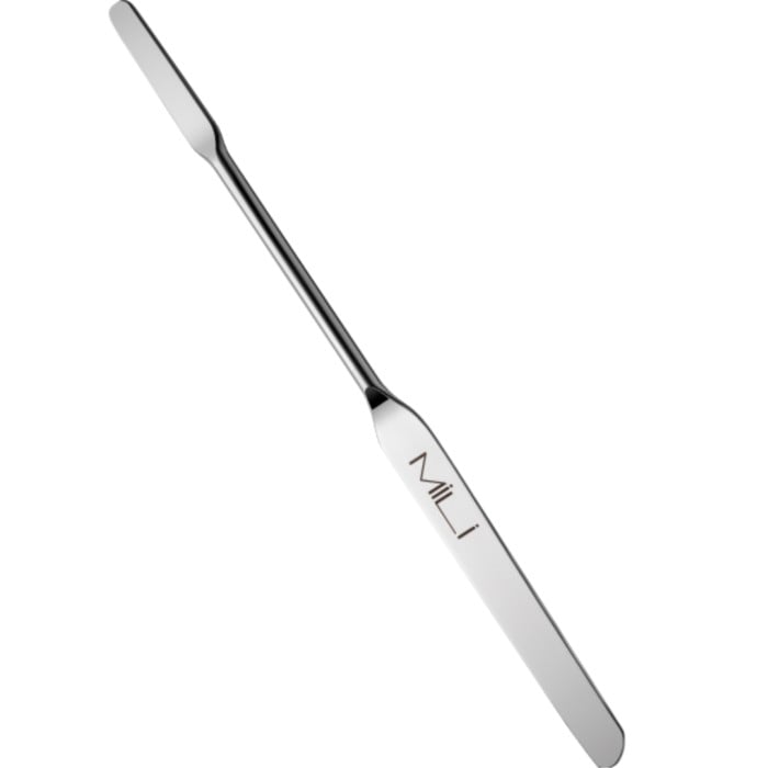 MILI Cosmetics Spatula av stål används för att skopa upp och mixa puder eller krämiga produkter på ett hygieniskt sätt.