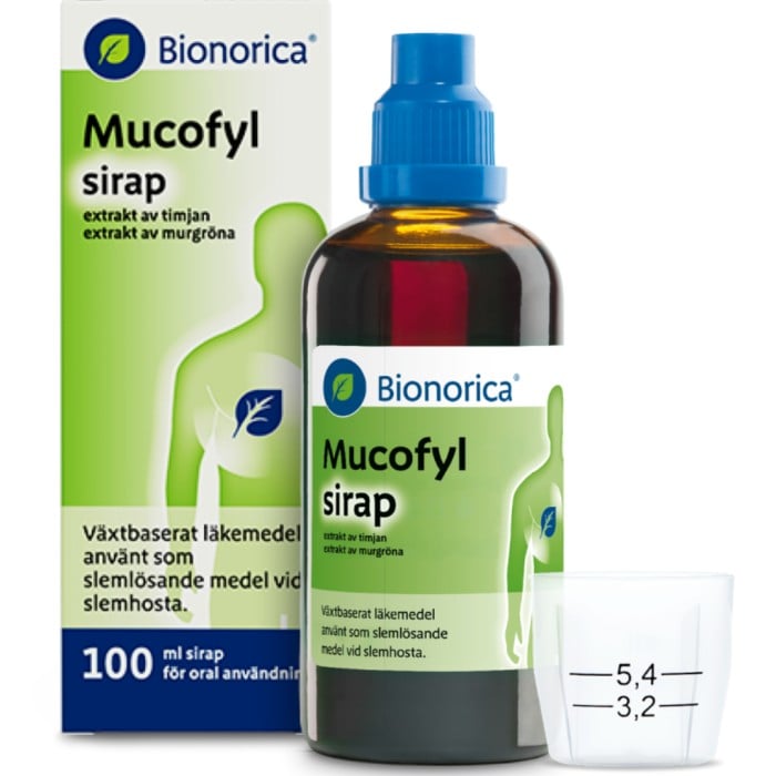 Mucofyl Sirap är ett växtbaserat läkemedel som används vid slemhosta. Mucofyl är kliniskt bevisat att minska hostattacker, lösa upp slem och lindra hosta. Kan användas av vuxna och barn från 2 års ålder. Mucofyl Sirap har en naturligt söt smak. Vegansk, laktos- och glutenfri. Utan tillsatt socker, fri från konserveringsmedel.
