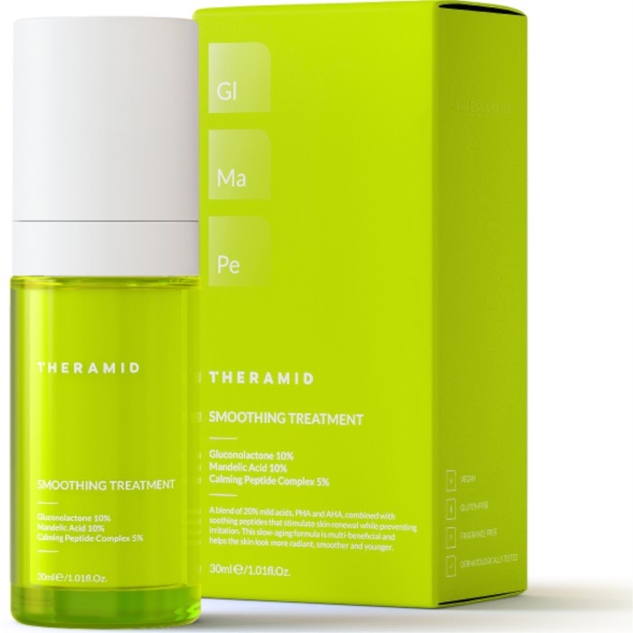Theramid Smoothing Treatment är en banbrytande anti-aging-produkt med lysterskapade effekt. Den innehåller total 20% behandlande syror, varav 10 % AHA och 10 % PHA. Detta aktiva exfolierande syrakomplex är dessutom kombinerat med ett lugnande peptidkomplex som också stimulerar hudförnyelse samtidigt som det förebygger irritation och verkar lugnande på huden.