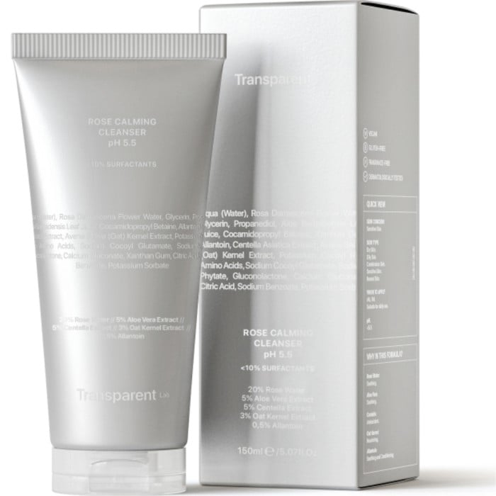 Transparent Lab Rose Calming Cleanser Ph 5.5 från Niche Beauty Lab är en mild ansiktsrengöring berikad med rosen- och centellavatten, aloe vera, havre och allantoin för att ge en mild och behaglig rengöring.