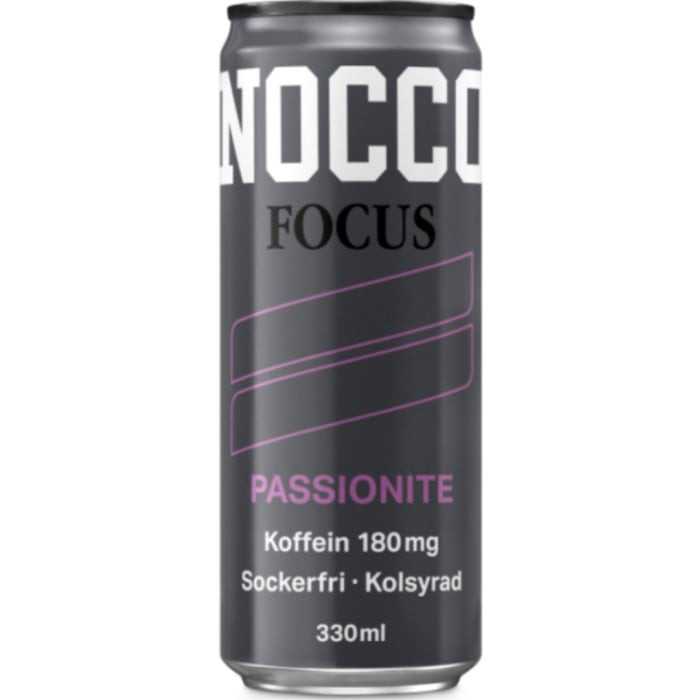 NOCCO Focus Passionite 330 milliliter är en kolsyrad dryck med koffein, grönt te-extrakt och vitaminer. Koffein bidrar till att förbättra koncentrationen.