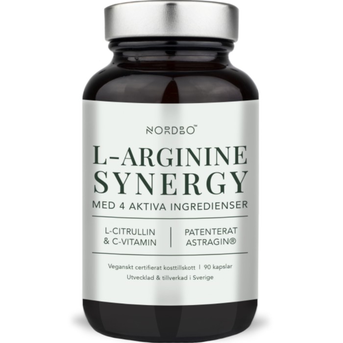 NORDBO L-Arginine Synergy är ett synergistiskt komplex som kombinerar aminosyrorna L-arginin och L-citrullin med C-vitamin (kalciumaskorbat) och Astragin®.