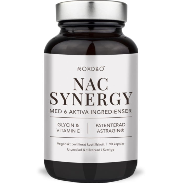 NAC Synergy är veganskt certifierad av Djurens Rätt och fri från gluten, socker, soja och laktos. Produkten är utvecklad och tillverkad i Sverige av NORDBO – ett familjeägt varumärke från Malmö. Burken är tillverkad av glas och locket av metall. Båda materialen kan återvinnas och skyddar produkten mot fukt och luft.