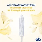 OB Tampong ProComfort Mini är gjord för dig som använder tampong för första gången, eller som har lite mens. OB Tampong ProComfort Mini är liten och smal med en avsmalnande topp samt har ett lent SilkTouch-hölje som gör att den är lätt att få på plats. OB Tampong ProComfort Mini passar också ofta bra i slutet av mensen då du blöder mindre. Tack vare de vridna kanalerna samlas mensen effektivt upp inuti tampongen och skyddar längre från läckage.