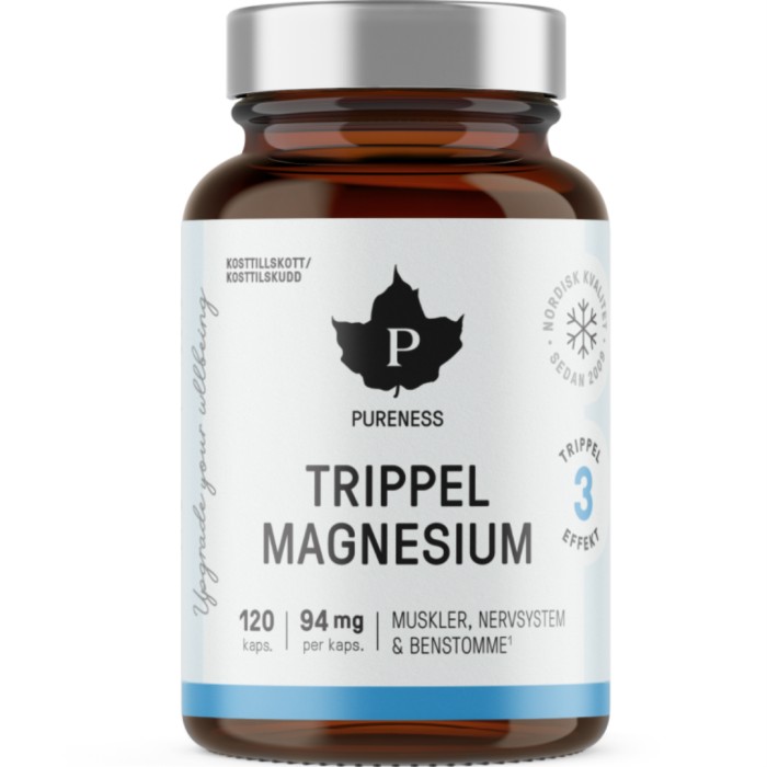 Trippel Magnesium från Pureness är ett kosttillskott som innehåller tre former av magnesium av högsta kvalitet: magnesiummalat, magnesiumglycinat och magnesiumtaurat. Kapselhöljet är gjort på bara cellulosa och vatten.