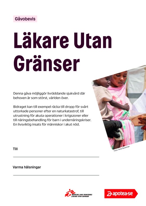 Genom att köpa Rädda liv med Läkare Utan Gränser bidrar du till livräddande sjukvård världen över. Gåvan räcker till att ge fem allvarligt uttorkade personer dropp efter en naturkatastrof, eller till en uppsättning operationskläder som kan användas vid livräddande operationer mitt i ett krig, eller till 16 påsar näringsberikad jordnötskräm som kan användas för att behandla undernärda barn vid en undernäringskris.