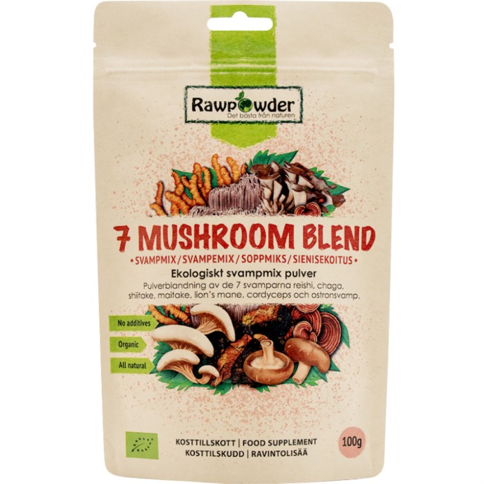 Rawpowder Mushroom Blend är ett pulver gjort på en blandning av sju olika svampar: reishi, chaga, shiitake, maitake, lion's mane, cordyceps och ostronsvamp. Samtliga svampar i pulvret är ekologiskt odlade och varsamt torkade. Pulvret är gjort av svamparnas fruktkropp och kan användas i olika drycker, kaffe, te, kakao men även i matlagning och bakning.