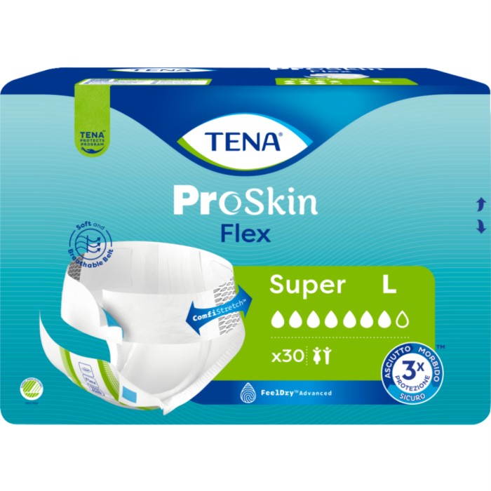 TENA Flex Super är ett mycket läckagesäkert och bekvämt bältesskydd, som tagits fram för att vara enklare och mer ergonomiskt att byta. Skyddet har dubbla absorberande kärnor med superabsorbenter.