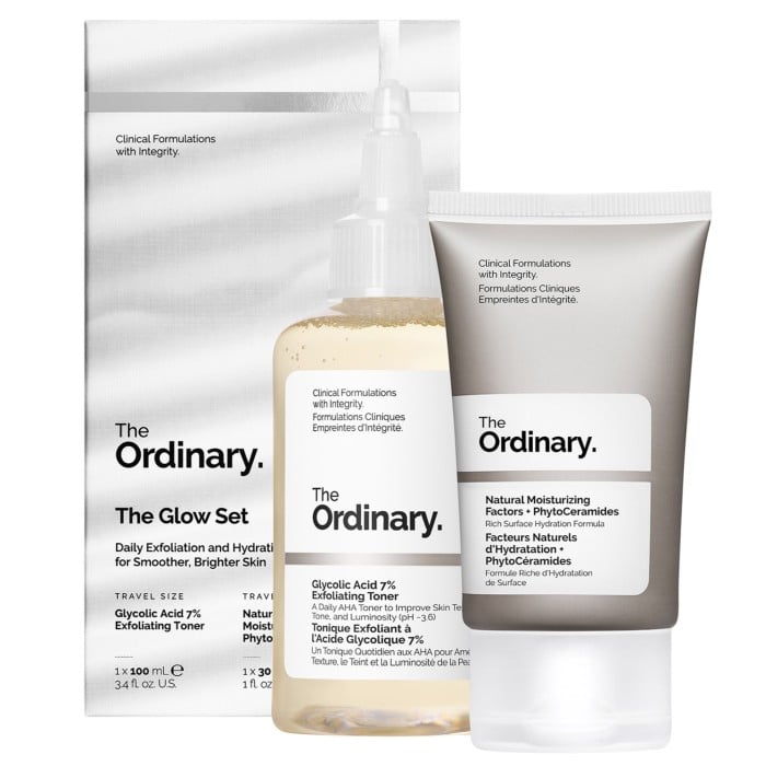 The Glow Set från The Ordinary är en duo med kompletterande produkter som ger daglig exfoliering och rik, återställande fukt. Ett set som gör att huden känns mjukare och får mer lyster. Setet innehåller Glycolic Acid 7% Exfoliating Toner och varumärkets rikaste fuktkräm som passar för torr hud: Natural Moisturising Factors + PhytoCeramides.