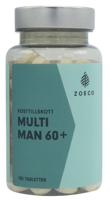 Zoeco Multi Man 60+ är ett kosttillskott som innehåller vitaminer och mineraler anpassade för män över 60 år. Rekommenderad dagsdos 1 tablett dagligen.